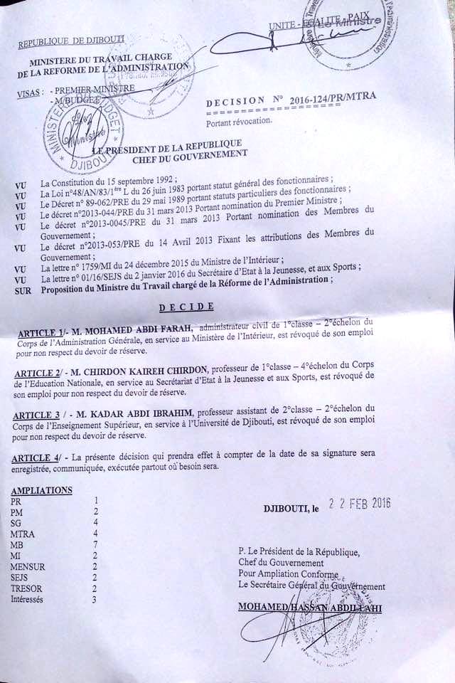 Arrêté le 14 janvier 2016 puis condamné le 19 janvier 2016 à deux (2) mois de prison avec sursis pour avoir dénoncé les agissements du gouvernement et pour avoir publié la photo de la petite Soumeya (âgée de 7 ans), victime du massacre survenu à Buldhuqo le 21 décembre 2015, lors duquel les policiers ont ouvert le feu sur une cérémonie rituelle privée, faisant au moins 29 morts d’après la Fédération internationale des ligues des droits de l’Homme, Kadar Abdi Ibrahim, co-directeur du journal de l’opposition « L’Aurore », vient d’être licencié par décision présidentielle en date du 22 février 2016, de son poste d’enseignant à l’Université de Djibouti et révoqué de la fonction publique pour son engagement politique dans l’opposition USN.