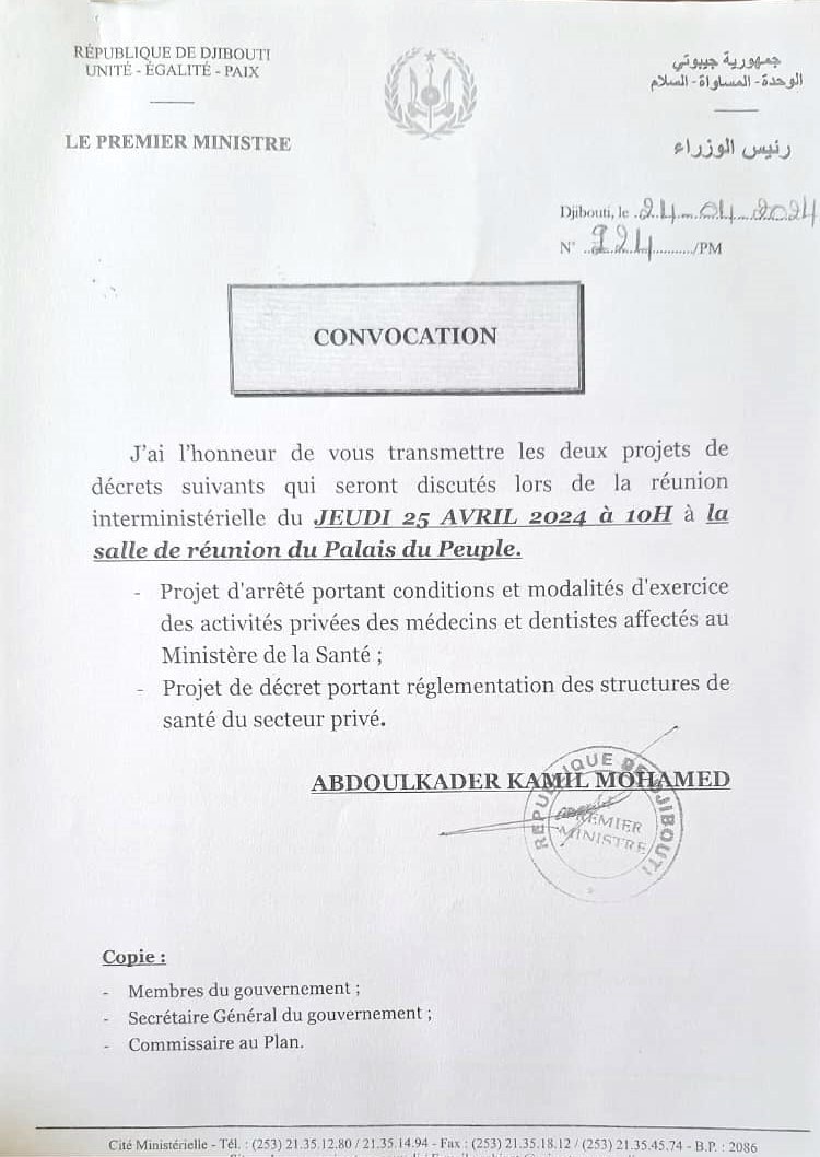 Une réunion interministérielle de formalité avait lieu le 25 avril 2024 au cités ministérielles à Djibouti pour discuter deux projets qui ont des liens directs avec la société VISION SANTÉ SAS.